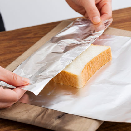 食パンをお好みのサイズにスライスして、一枚ずつアルミホイルで包み、