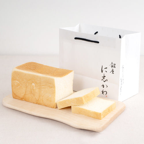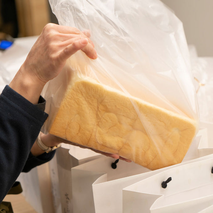 手提げ紙袋を採用し、おもたせにも最適です。手ぬぐいの専門メーカー・かまわぬと共同した食パン専用風呂敷(店頭で直接購入のみ)もあります。
